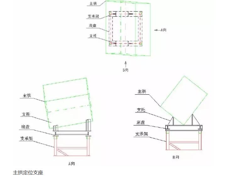 4.主拱與地面呈一定角度,定位控制難度較大,必需根據(jù)主拱傾斜角度,在兩個(gè)方向設(shè)臵帶角度的定位支托,以使主拱的定位準(zhǔn)確,主拱定位支座見(jiàn)圖